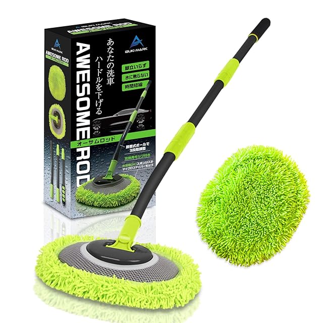 AWESOME ROD(オーサムロッド) 洗車モップ – 3段階調整で快適洗車! 洗車モップ・洗車スポンジ・洗車ブラシの長所を兼ね備えた万能洗車用品! 50cm・85cm・120cmの3段階調整が可能で、手持ちの洗車スポンジとしても、ロングポールでトラック洗車にも対応。15度のカーブ設計で脚立なしでもルーフや高い部分を楽に洗えます。 ・吸水性抜群のマイクロファイバーモップ&スポンジ内蔵で傷を防ぎながらしっかり洗浄 ・脱着式ポール採用で、収納しやすく軽量で扱いやすい ・交換用モップも常時販売で長く使える ・洗濯機OK! 冬場の冷水や手荒れ対策にもおすすめ 洗車道具選びで迷ったらこれ!日本ブランドの安心品質で、手軽に効率よく洗車できます。