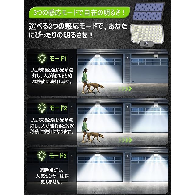 【3つの点灯モードで多彩なシーンに対応!】 利用シーンに合わせて、3種類の照明モードを自由に切り替え可能! モード 1(強光センサーモード):人を感知すると最も明るく点灯し、約10~15秒後に自動消灯。玄関・ガレージ・防犯用途におすすめ! モード 2(微光センサーモード):通常は微光を維持し、人が近づくと強光に切り替わる。庭や通路の照明にぴったり! モード 3(常時微光モード):夜間はずっと微光をキープし、人の動きに関係なく点灯。ベランダや公園の小道など、落ち着いた照明が欲しい場所に最適。
