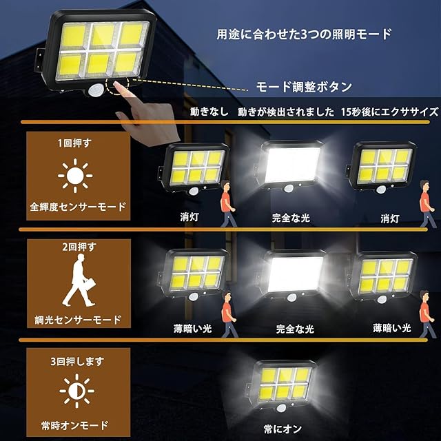 ソーラーライト 屋外重要なヒント: 照明をアクティブにするための2つの条件があります。●1、太陽電池パネルは暗闇に ●第二に、ランプ本体は物体の動きを感知します。(第1番目のモード)人や動物の動きを検知すると自動的に高輝度で点灯し、動きがない場合は約15秒後に消灯します。(第2番目のモード)人や動物が検出範囲に達すると自動的に高輝度で点灯し、動きが止まると約15秒後に低照度に戻ります。(第3番目のモード)夜間または暗闇では、充電がゼロになるまで低輝度で点灯します。3つの照明モードは、日中や明るい場所では点灯しません。