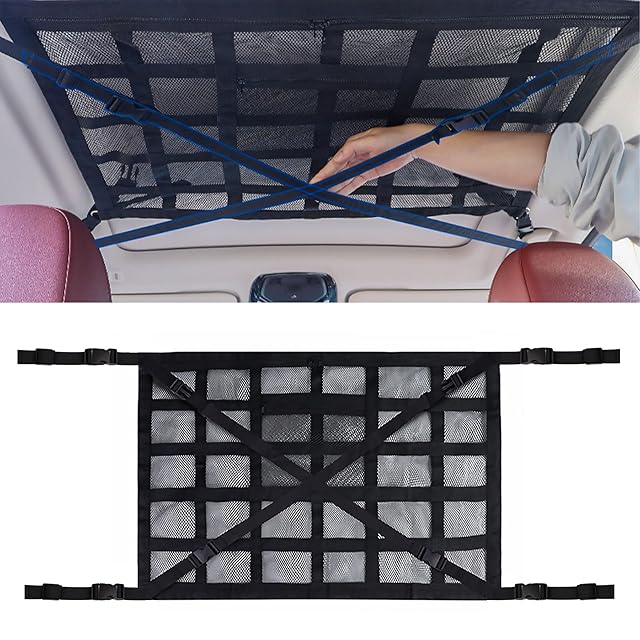 CZEAR 車 ネット 天井 車 収納 車 ネット 車用天井収納ネット 垂れにくい カーゴ ネット 簡単取り付け 車中泊 ダブルファスナー 荷物落下防止 バックル固定 大容量