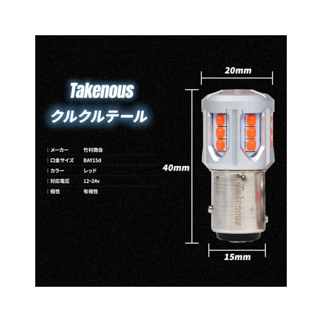 商品名:Takenous 竹村商会 S25 LED ダブル クルクルテール レッド 12v 24v 180度段違いピン BAY15d (S25ダブル)