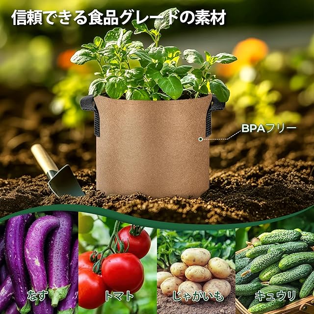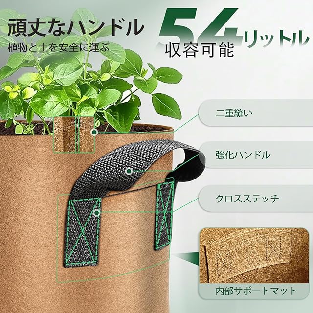 「果樹・野菜・花栽培に最適」底部は高品質のポリエステル糸で作られており、耐腐食性、高強度があるので、植物や土がたっぷり入っても大丈夫です。植木や果樹、ジャガイモ、トマト、唐辛子、野菜を栽培するにも最適です。