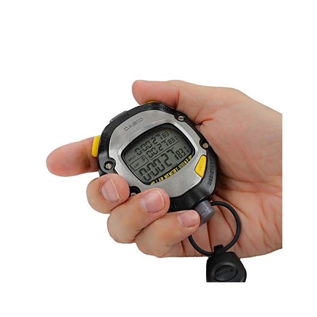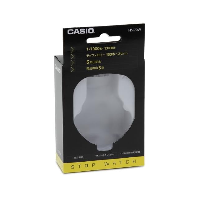 機能:ストップウオッチ (1/1000秒、10時間計 (通常計測、ラップ・スプリット計測、1~100位同時計測)、ラップ・スプリットを100本×2メモリー、時刻・カレンダー表示、操作音ON/OFF切替機能、フルオートカレンダー、12/24時間制表示切替、電池寿命約5年