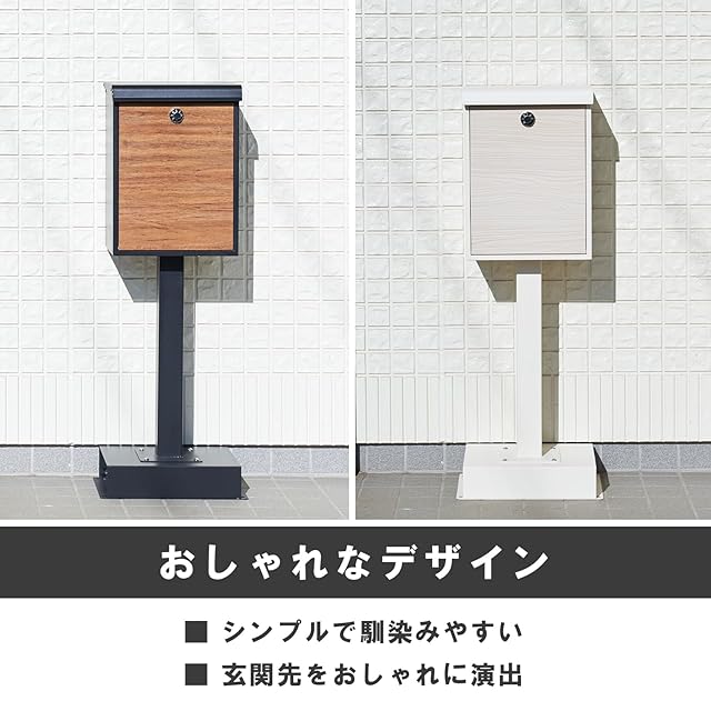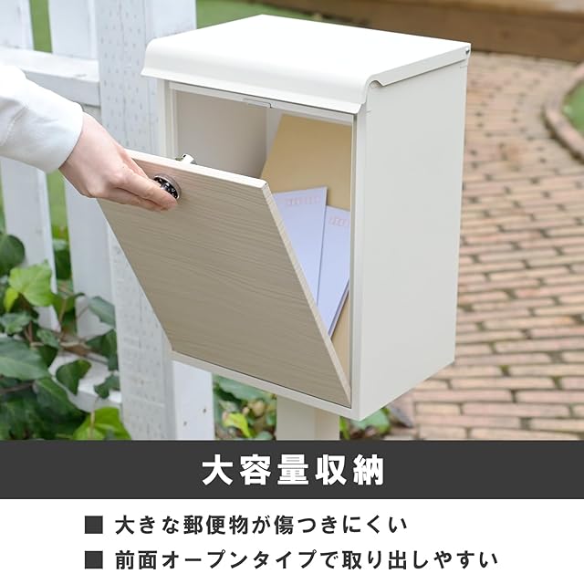 【商品特徴】支柱を取り付けるだけの簡単組立です。屋外設置が可能な防雨設計(防水規格 IPX4取得)※完全防水ではありません。A4サイズ対応※最大 25×38×3cmまで投函可能。アンカー不要でブロックやレンガなどの重石を設置できます。結露から郵便物を守るための穴付き底板仕様です。投稿口(ふた付き)が上部にあり、郵便物を曲げずに投函可能です。郵便物が取り出しやすい前面オープンタイプです。ダイヤル錠で簡単操作で施錠可能※解錠番号は変更できません。