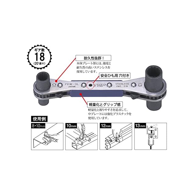 商品名:トップ (TOP) ラクラッチ 8x10㎜ 12x13㎜ 4サイズ板ラチェット 20°送り 本締め可能 電工 電気 工事 PRW-3L 燕三条 日本製