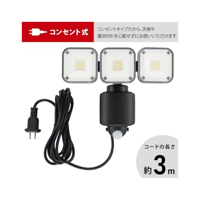 商品名:オーム電機monban センサーライト 屋外 人感センサー コンセント ledライト ac電源 4500ルーメン 3灯 IP44 防犯 自動点灯 消灯 ガーデン 庭 玄関 駐車場 LS-A450W3 07-8810 OHM