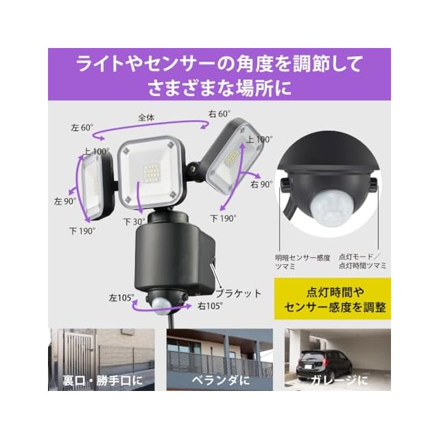 【安心を一番に考えた機能】コンセントタイプなので天候や電池切れの心配なし。3灯LEDライトは角度調節可能、照らしたいところをしっかりと照らせます。点灯モードはツマミで簡単調節、明暗センサーの感度もご自身で調整が可能です。IP44 (IEC規格)の坊沫仕様。
