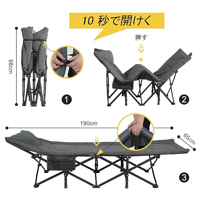 折りたたみベットの側に付けな袋は携帯電話、水などを保管できる、使いやすいです