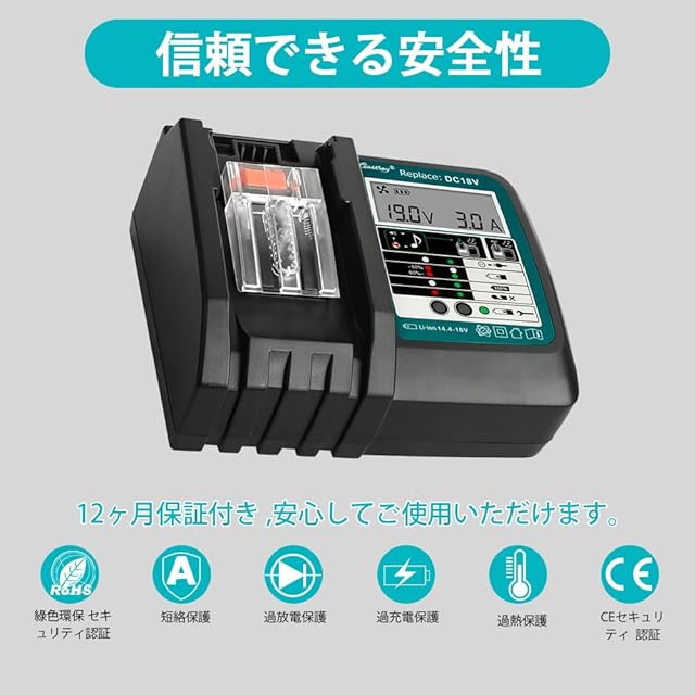 【安全性と12ヶ月付き】】本充電器はPES認証を取得済みです。多重保護回路を内臓し、過充電防止・過放電防止・過電流防止・過電圧防止などで、充電器自体はもちろん、バッテリーのセキュリティーもしっかり守っており、安心してご利用いただけます。また、ご満足な体験をご提供するために、本製品は12ヶ月付きです。ご使用中に何か問題がありましたら、どうぞ遠慮なくご連絡ください。