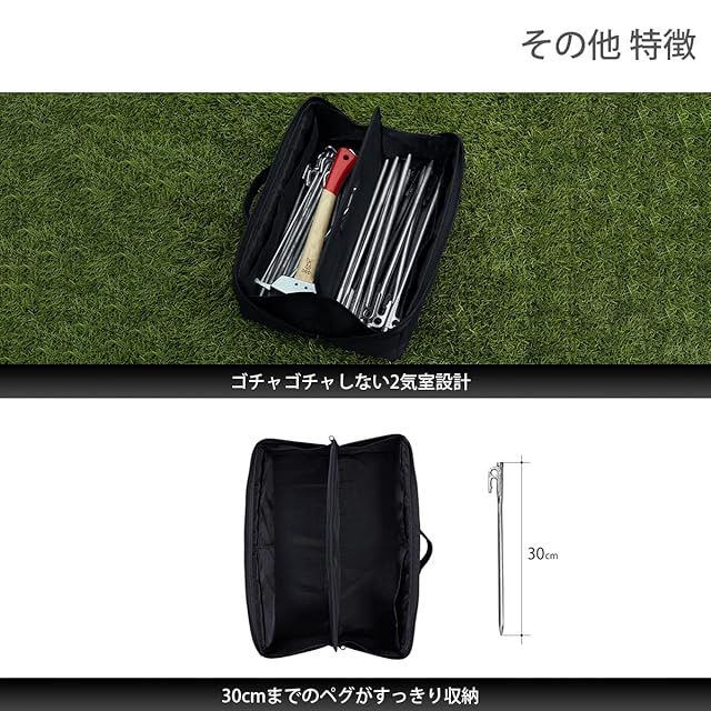 鍛造ペグ30cmを40本、ハンマー2本とガイロープが収納可能。