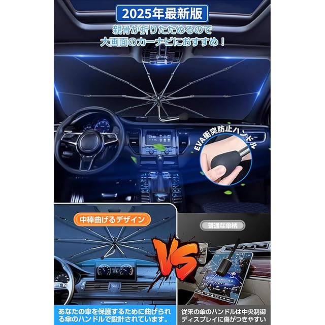 【曲がる可能な傘柄・EVA製傘柄カバー・ダッシュボードを守る‼】従来のサンシェードとは異なり、この新しいサンシェードは中棒が曲がる設計になっており、ダッシュボードの高さに合わせて自由に調整できます。また、傘の柄の部分は高品質なEVAで作られており、滑り止めだけでなく柔らかく、ダッシュボードや内装を傷つける心配がありません。