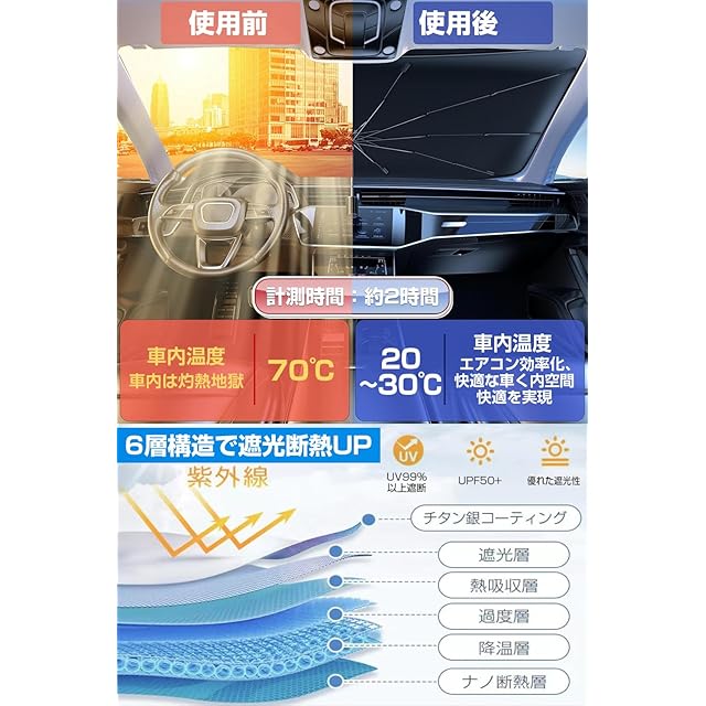 【2025強化版登場サンシェード】サンシェード傘面は6層ナノ高分子断熱材料を採用し、外側はチタンシルバーコーティングで、強い日差しを反射して車内温度の上昇を抑え、99%の有害な紫外線を遮断することもでき、快適な車内空間を実現します。そして、駐車時大事な愛車を太陽光による損傷やハンドル焼け、ダッシュボードなどの樹脂部分の日焼けから守り、内装の劣化を防止し、使用寿命を延長します。