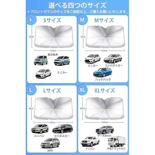 【フロントガラスにピッタリフィット&幅広い車種に対応】カープのある骨組みで車内のフロントガラスにぴったりフィットして、周囲の隙間を最大限に減少、光線カット率がさらにUP!サイズ:S(125*65cm)、M(135×75cm)、L(140×78cm)、XL(144×84cm)の4サイズをご用意。 99%の車のフロントガラスに対応できます。(ご注意:車型によって、多少誤差がありますが、購入前にご愛車のフロントガラスのサイズをご確認ください。)