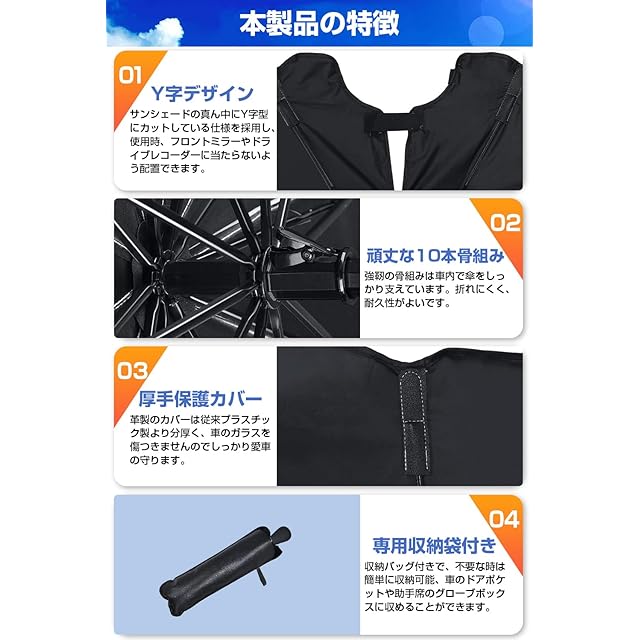 【Y字デザイン・露先保護カバー】サンシェードの真ん中にY字型にカットしている仕様を採用し、使用時、フロントミラーやドライブレコーダーに当たらないよう配置できます。駐車際にドライブレコーダーは正常に撮影します。傘の露出先には長いレザー製の保護カバーを使用しており、厚くて破損しにくく、車のフロントガラスを傷つけません。