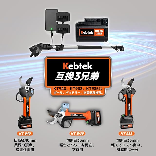 【Kebtek互換3兄弟、特許設計】:電動剪定鋏KT940、KT E35とKT 933はポール、バッテリー、充電器互換できます。Kebtek自主開発の特許設計として、パワフルなブラシレスモーターを採用しています。負荷が掛かった時に、抵抗が感じるではなく、さらにもう一押しするような感じがあります。腕、肩への負荷が小さく、庭木の剪定、造園作業、伐採や刈り枝の処理には抜群の作業能力で欠かせなくなります。