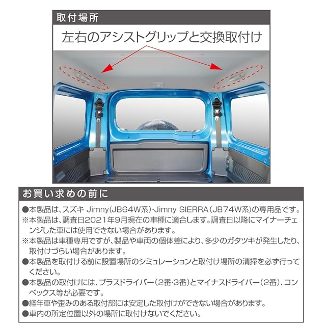 後席用アシストグリップのネジ穴を利用し、加工無しで取付けが可能です。