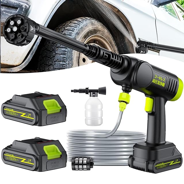 Zyvrexコードレス高圧洗浄機は、7Mpaの強力水圧と13mの長射程で車・駐車場・ブロック塀などの頑固な汚れを簡単除去!大容量バッテリー2個付きで最大50分連続使用可能、6in1多機能ノズルで洗車から苔除去・水やりまで幅広く対応。節水設計(水使用量20%削減)でエコに配慮し、軽量コンパクト設計で女性でも楽々操作。電源不要で屋外作業も安心のプロ級洗車機です
