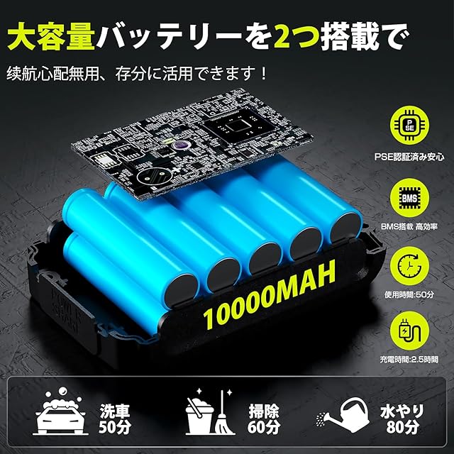 ✅【大容量バッテリーを2個で洗車勝手】充電式高圧洗浄機は便利性と長時間駆動を両立しています。新エネルギ技術を採用して10000mAhバッテリーを2つ搭載,一度の充電で驚異の最大50分連続稼働を実現。洗車なら一つで十分です。2つの電池を交換使用して、1回の充電で4~5台洗車可能。コードレス高圧洗浄機で面倒な準備は不要で、電池をパチッと装着するだけで、狭い場所でもしてすぐに清掃開始。電源のない屋外でもストレスフリーです。