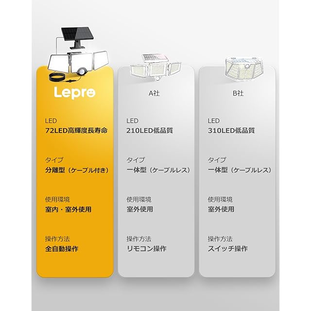 商品名:Lepro ソーラーライト 人感センサーライト 防犯ライト ガーデンライト 3灯式 屋内・屋外使用可 夜間自動点灯 昼間自動充電 人が離れたら自動消灯 4.8Mケーブル 1000ルーメン 超高輝度 角度調整 120°感知角度 270°発光範囲 IP65防水 省エネ 壁掛け式 電源不要 駐車場/玄関/軒/庭/ガレージ 防災・停電対策 最新一体・分離型 単品 ブラック