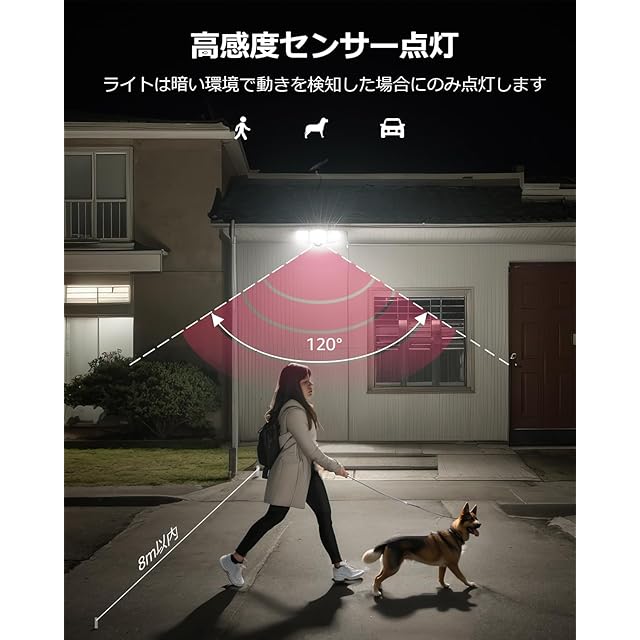 【広範囲照射&人感センサー点灯】昼光色6500Kの超高輝度LEDチップを搭載し、明るく拡散する光で広範囲を照らします。夜間に人や車の動きを感知すると、ライトが自動的に約20秒間点灯します。両側のライトは角度調節が可能で、照射方向や範囲を大幅に広げられるため、コーナーや狭い通路などでも手軽にご利用いただけます。