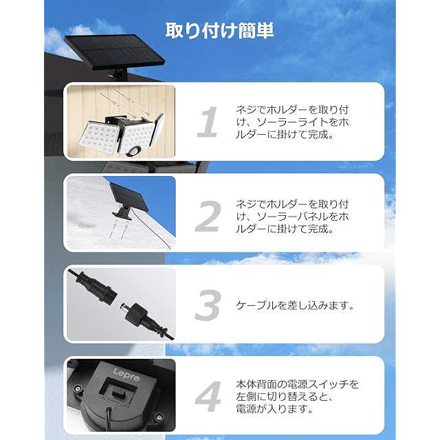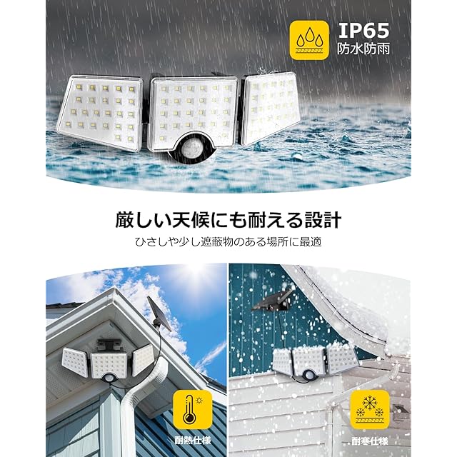 【屋外設置可能!IP65防雨仕様】防水レベルはIP65で、大雨の日でも安心してご使用いただけます。Leproソーラーライトは耐久性に優れたABS樹脂を使用しており、耐熱性・耐寒性にも優れ、悪天候や過酷な環境にも対応可能です。玄関、ガレージ、駐車場、庭、階段、通路、ご自宅周りの防犯など、さまざまなシーンで大活躍します。※複数台を設置する場合は、センサー同士が干渉しないよう、できるだけ距離を空けて設置してください。