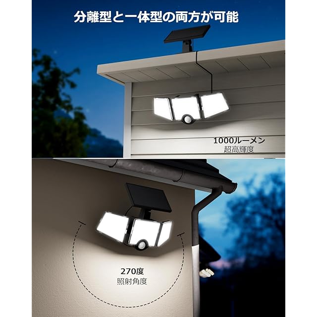 【最新センサーライト:超高輝度3灯式】一体型・分離型の両用設計で、屋外だけでなく室内でも使用可能です。ソーラーパネルはライト本体から分離させることで、付属の延長コードを使って最大約4.8m離れた場所に設置できます。低温環境でも使用可能なソーラー充電式電池を内蔵し、曇りや雨の日でも日中に充電できるため、冬でも安心してお使いいただけます。