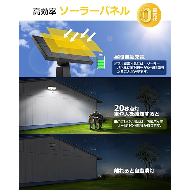 【省エネ&停電・地震対策】一度スイッチをONにすれば、日中の太陽光で自動的に充電され、電気代が一切かからない省エネ設計です。停電対策にも最適で、地震や台風などの災害で電源が止まっても、照明機能はそのまま維持されます。玄関やガレージの入口に設置し、LED投光器としてご使用いただくのもおすすめです!