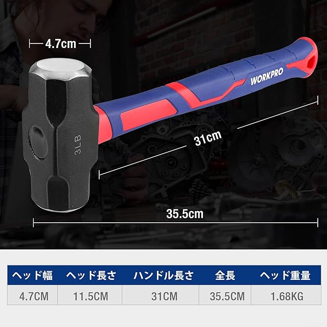 商品名:WORKPRO 両口ハンマー 石頭ハンマー 八角玄能 グラスファイバー柄 約1.36kg(3LB)鉄工 · 金工 · 木工 土木建築 解体作業 キャンプ用