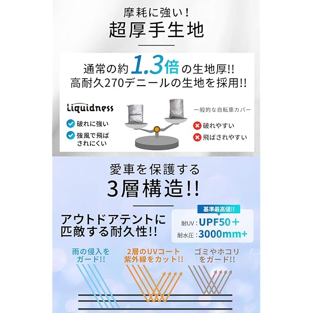 ✅【アウトドアテントに匹敵する耐水圧、耐紫外線性能】 3層に重ねた特殊コーティングにより 雨、紫外線に対して高い耐久性、効果持続性を実現しました。 耐水圧3000㎜、UPF50+はサイクルカバー最高クラスです。