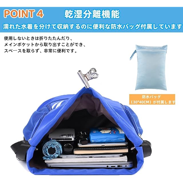 【乾湿分離機能&引き締める設計】:メインバッグの巾着デザインにより、巾着タイプの開口が物品の出し入れもしやすいです。メインルームにはオープンポケットx2+サイドポケット×4があり、また、濡れた水着を分けて収納するのに便利な防水バッグ(30cm*40cm)も付属しています。濡れたものと乾いたものを完全に分離して収納できます。使用しないときは折りたたんだり、メインポケットから取り出すことができ、スペースを取らず、非常に便利です。