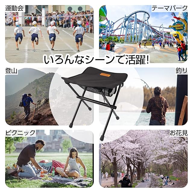【コンパクト・持ち運び便利】この椅子は組み立てと収納はとても簡単で、コンパクトに収納し、リュックやかばんなどに入れて、折りたたみ傘の感覚で持ち運べるミニチェアです。椅子座面の裏側には一体型収納袋が付いていて、収納袋紛失の心配もなし。 【安定した座り心地】折りたたみ椅子組み立て後の座面サイズは32㎝×32㎝、高さ33㎝で大きめなサイズとなっています。4本足のバランスが良く、椅子脚には滑り止めも付いています。どこでも安定した座り心地を楽しめます。折りたたんだ後は長さ32㎝、直径約8㎝なコンパクトサイズになります。アウトドア最適な折り畳み椅子です。 【耐荷重約100㎏・長持ち】椅子座面は丈夫で耐久性のある600Dオックスフォード生地を採用し、フレーム部分は十分な強度を有しているA6061アルミニウム合金で作られています。耐荷重およそ100㎏、頑丈で安定性のあるアウトドアチェア! 【超軽量・携帯便利】椅子のフレーム部分が採用されているA6061アルミニウム合金は高強度だけではなく、超軽量な材質にもなっています。このA6061アルミ合金で作られた折りたたみ椅子の重さはたったの509gです。500mlのお水一本と同じくらいの重量で、リュックやかばんに入れて、持ち歩いても負担にはなりません。どこでも手軽くチェアを出して使えます。椅子がないの心配はいりません。 【いろんなシーンで活躍】キャンプ、釣り、BBQ、登山、お花見、ピクニック、スポーツ観戦、花火大会、子供の運動会、家族でピクニック、テーマパークでの待ち時間もこの折りたたみ椅子を使って楽になります。地震や水害などでの避難時の防災グッズとしても使えます。