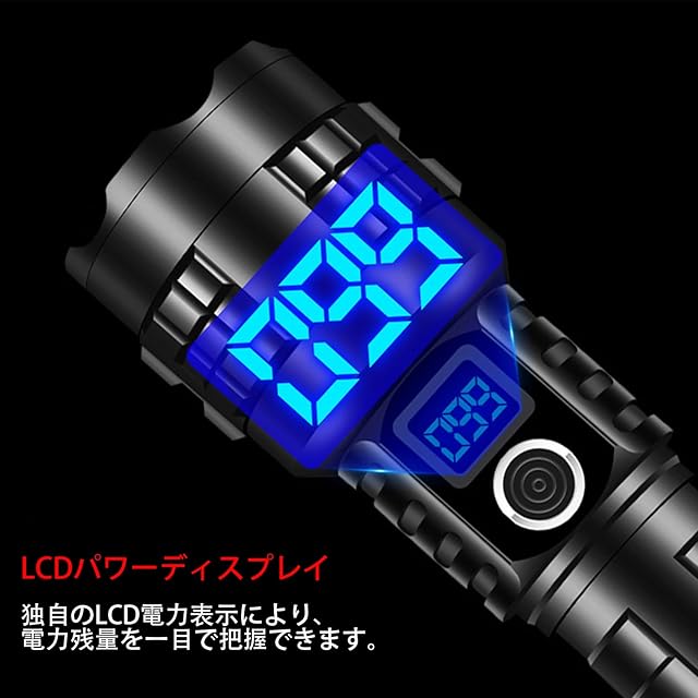 【LCDパワーディスプレイ | 懐中電灯 充電式 | USB出力】この懐中電灯 強力は高ルーメンの充電式で新しくアップグレードされ、1回の充電で最大12時間使用でき、通常のLED懐中電灯よりも長持ちします。 ユニークなLCD電力表示により、一目で残量を把握できます。懐中電灯 led 強力 軍用 最強はUSB-Cケーブルで充電できるため、フラッシュライトをより便利に充電できます。