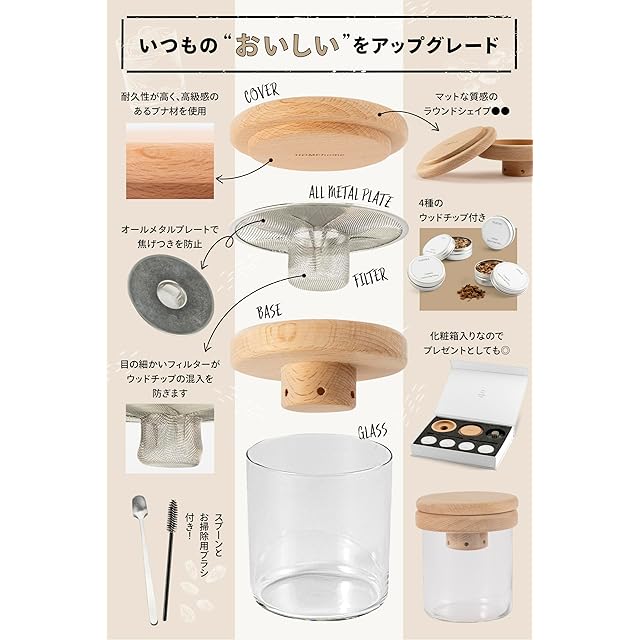 ✅ギフトボックスが特別感と高揚感をさらに高めてくれます。頑張った自分へのご褒美にも、大切な人へののギフトにも最適です。充実のアクセサリも嬉しいポイント。高級感のあるチップ用のスプーン、フィルター掃除用のブラシ、おしゃれなパッケージデザインのウッドチップはサクラ、オーク、ヒッコリー、アップルの4種のフレーバーです。※トーチは付属しておりません。