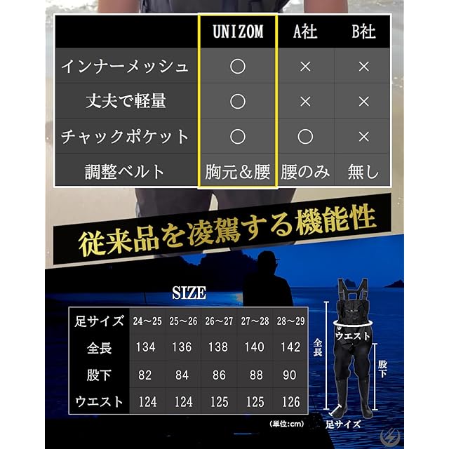商品名:[unizom] ウェーダー 釣り 胴長 長靴 【インナーメッシュ】 ラジアルソール 防水 スーツ チェストハイ フィッシングウェーダー (26cm~27cm, ブラック/ナイロン インナーメッシュ搭載)