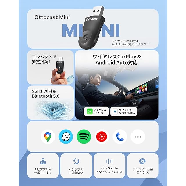 商品名:【公式】OTTOCAST オットキャスト Mini 2025最新 ワイヤレスCarPlay/Android Autoアダプター ミニ 純正有線CarPlay/Android Auto対応車専用 Bluetooth音楽/通話対応 プラグ&プレイ 自動接続 98%以上の車種適合 技適認証取得済