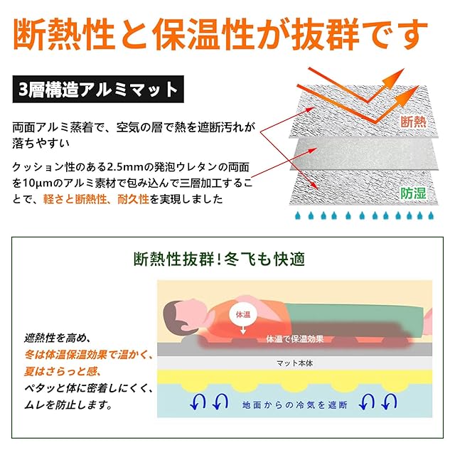 優れる素材&3層構造:アルミホイル製、防水性、耐寒性、防湿性、頑丈で耐久性があります。両面にはアルミ蒸着が施されているため使用中は内側の熱が外部に放散せず、外部の湿気や冷気も遮られます。保温性、断熱性が抜群です。中間層は発泡ポリエチレンで作られるので一層柔らかくなり、座り心地も良いです