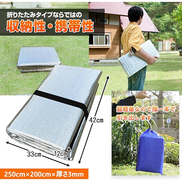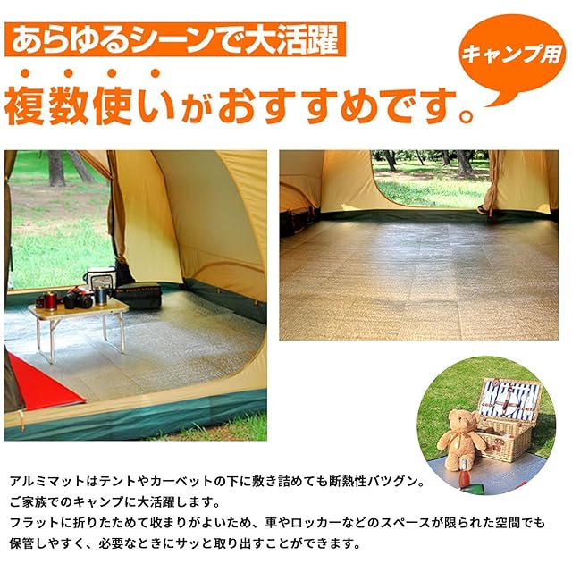 多用途に使える:レジャー以外にもカーペットの下の断熱材・子供用プレイマット・防災用品の備品などにもお使いいただけます。アウトドア用として登山やキャンプ、釣りに、また、ハイキングやスポーツ観戦に地面やシートに敷いたり、くるまって直射日光を避けたり、寒さ除けとして使えます。キャンプ時は、テント内で寝袋下にインナーマットとしても使うことができ、体温が保たれるので快適に利用できよう