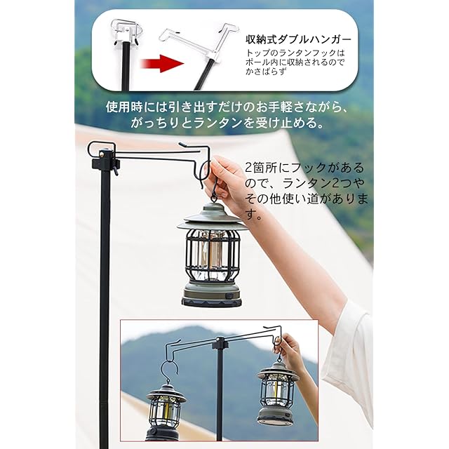 【収納式ダブルハンガー】トップのランタンフックはポール内に収納されるのでかさばらず、使用時には引き出すだけのお手軽さながら、がっちりとランタンを受け止める。2箇所にフックがあるので、ランタン2つやその他使い道があります。