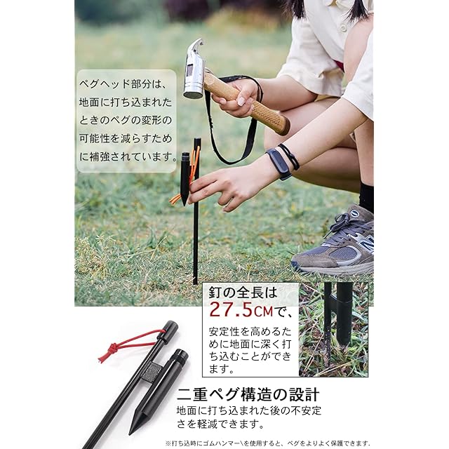 【安定性は良い、使いやすい】ペグ全長は25cmで、二重ペグ構造の設計により、地面に打ち込まれた後の不安定さを軽減できます。 ペグヘッド部分は、地面に打ち込まれたときのペグの変形の可能性を減らすために補強されています。(打ち込時にゴムハンマーを使用すると、ペグをよりよく保護できます)。市販のランタンポールとは異なり、直径1.6cmのポールを使用しています、ネジ式の連結でしっかりとした造り、安定性に優れています。