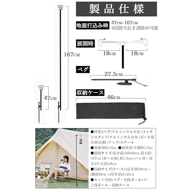 【軽量、持ち運びが便利です】ランタンスタンドはコンパクトで軽量で、収納袋に入れて簡単に収納できます。ランタンポール収納後の長さは45cm、重さは0.55kg、ポール径約1.6cm。ソロキャンプの際にも持ち運びが容易です。耐荷重は約3kg。ほとんどのキャンプライト(イルランタン、ハリケーンランプ、灯油ランタン、LEDランタン)の重量は約0.5kg~2kgなので、使用に適しています!(注:製品はランタンスタンドであり、キャンプライトは含まれません)