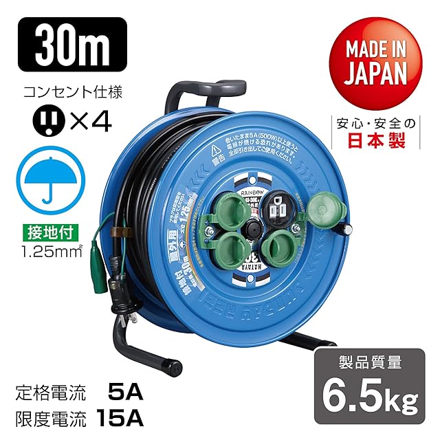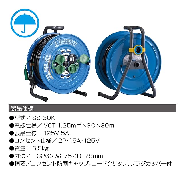 ハタヤ (HATAYA) コードリール 屋外用 (防雨型) 100V型 コード30m 太さ1.25㎟ 標準型 接地付 コンセント4個 コンセント防雨キャップ プラグカッパー1個付属 家庭用 工場用 建設現場 サンデーレインボーリール SS-30K