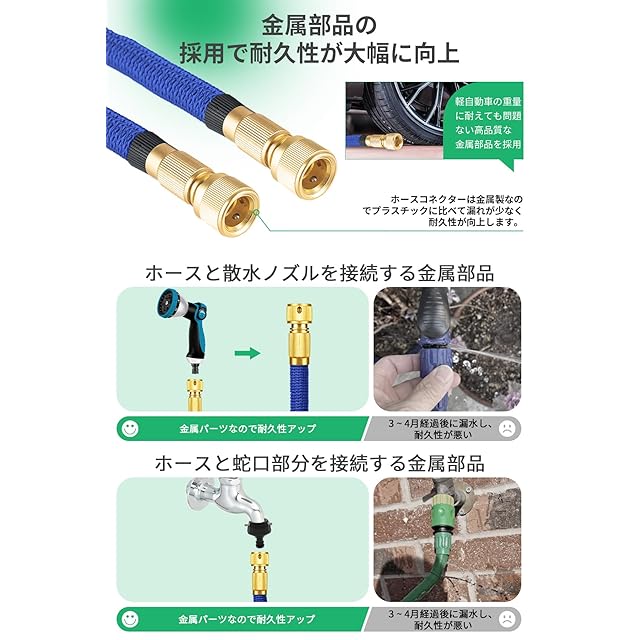 【高品質ラテックスを採用&優れた伸縮性】3倍伸縮ホースは、従来品を改良しました。 伸びるホース内層には伸縮性と回復性に優れた高品質2mmラテックスを採用し、伸縮ホースの耐久性と使用時の伸縮速度が向上しました。 外層は耐摩耗性に優れた3450D素材で作られており、伸びるホースが硬い路面を引きずったときに内側のラテックスが傷つくのを防ぐ。 また、伸縮ホースは-10℃~60℃の環境下で1~3倍の長さに伸ばすことができます。多くの地域で、いつでも問題なく使用できる。