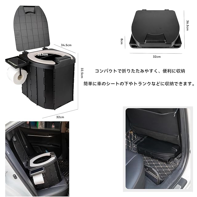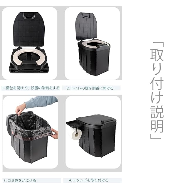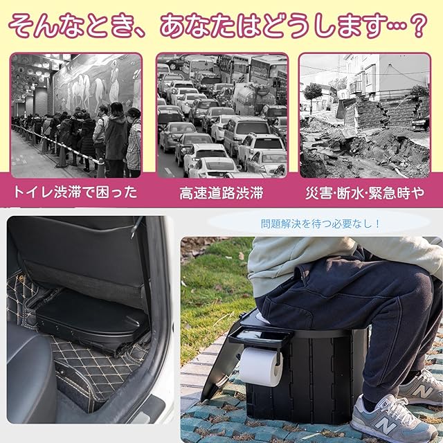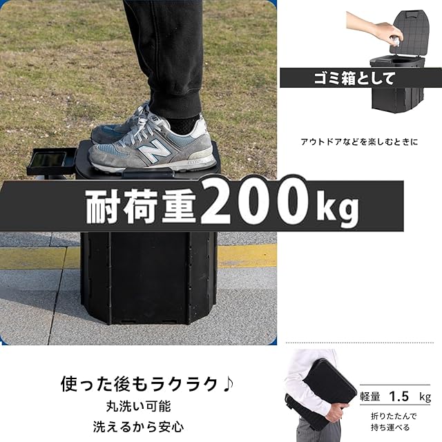 ポータブルトイレ・耐重200KG: この簡易トイレは非常時の避難用としてだけでなく、高速道路の渋滞時やアウトドア活動でも大活躍します。普段はスツールやゴミ箱としても利用可能。最大耐重200KGなので、特に男性におすすめです。