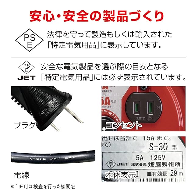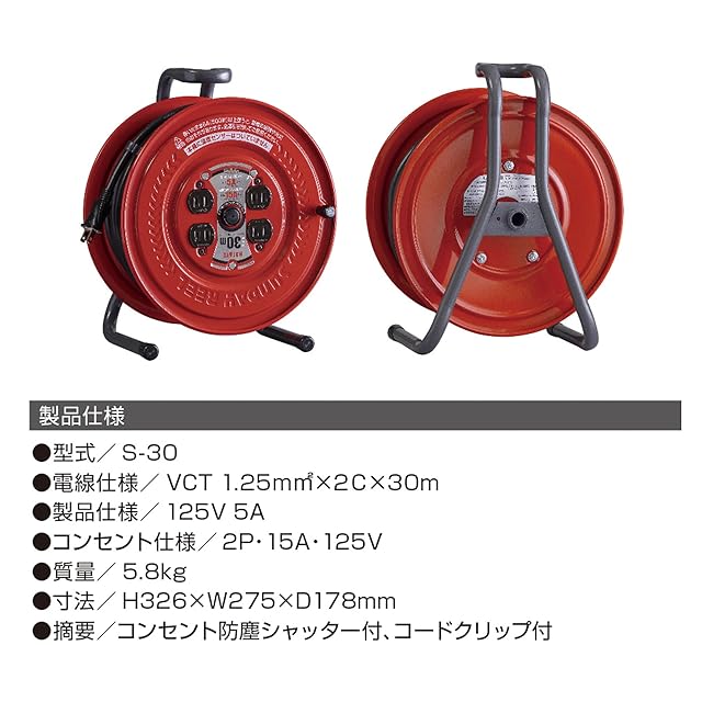 商品名:ハタヤ (HATAYA) コードリール 屋内用 100V型 コード30m 太さ1.25㎟ 標準型 コンセント4個 コンセント防塵キャップ 前面フラットパネル 家庭用 工場用 建設現場 サンデーリール S-30