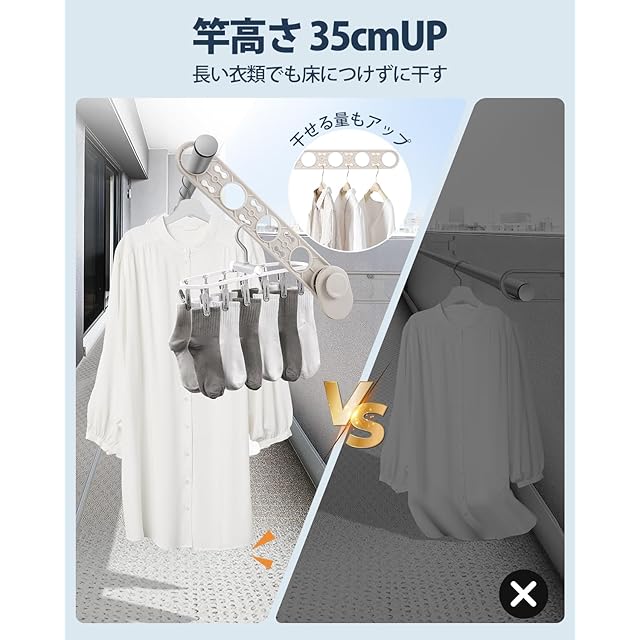 4.【高さアップ&布団干し】:長い衣類を干すとき、よく床について汚れるという場合がございますが、本製品を取付後、丈が長い衣類やシーツを干すとき、衣類の高さを最大35cm高くすることができ、2本竿を通せば、乾燥スペース不足の問題を効果的に解決し、布団も干せ、外干しの悩みが一気に解決!