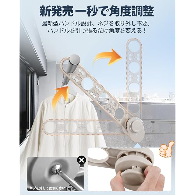2.【2025年最新型設計・操作もっと簡単!】:本製品はお客様のニーズに応じてアップグレードされ、瞬間に角度調整、より多くの衣類を乾燥させるようにフックが追加され、洗濯物の干せる量がアップ!