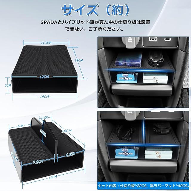 1.【対応車種】:ホンダ ステップワゴン AIR SPADA RP6/RP7/RP8 R4.5-現行。注意:SPADAとAIRのコンソールの高さが異なるため、SPADAとハイブリッド車の場合、組み立て方法1のみ設置可能、真ん中の仕切り板は設置できない場合がございます。注意:年式・グレード・オプション等により適合しない場合が御座います。商品発売後に発売される新型車両には適合できなくなる場合もございます。形状をご確認いただいた上、お買い求めください。