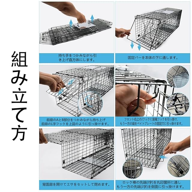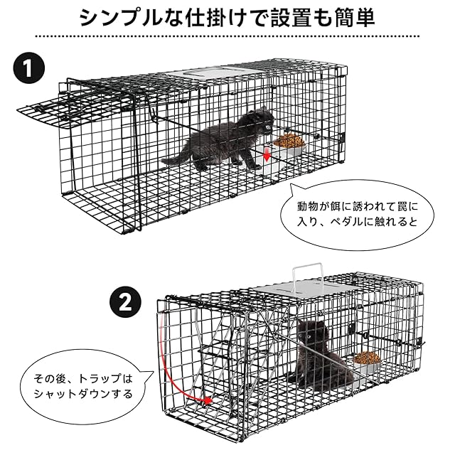 【シンプルな仕掛けで設置も簡単】 動物愛護法や鳥獣の保護及び管理並びに狩猟の適正化に関する法律 (鳥獣保護の狩猟に関する法律)に準じてお使い下さい。捕獲器の後ろの方へ餌を置き、板を踏みやすく工夫することで、しっかりと猫を閉じ込めることができます。捕まえたい小動物のサイズに合わせて捕獲器のサイズを選びしてください。