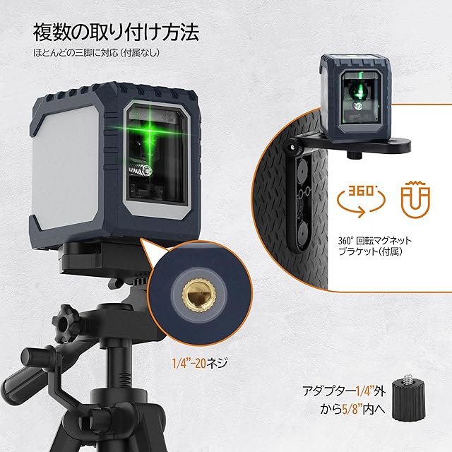 【小型軽量】コンパクト設計になっており、持ち運びは非常に便利です。充電式バッテリーは最大5時間の作業時間を提供します。ご注意:測定距離は光の影響を受けます。明るい環境では最大7メートル、暗い環境では最大30メートルまで測定可能です。屋外での使用は、パルスモードでGIGMANレーザー受光器との作業をお勧めします。