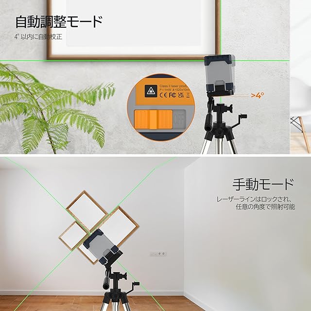 【自動水平&手動モード】振り子のロックを解除すると、レーザーレベルは4°以内に自動水平になります(そうでない場合はレーザーが点滅し続けます)。振り子をロックして手動モードに切り替え、異なる角度からのアライメントニーズに対応します。